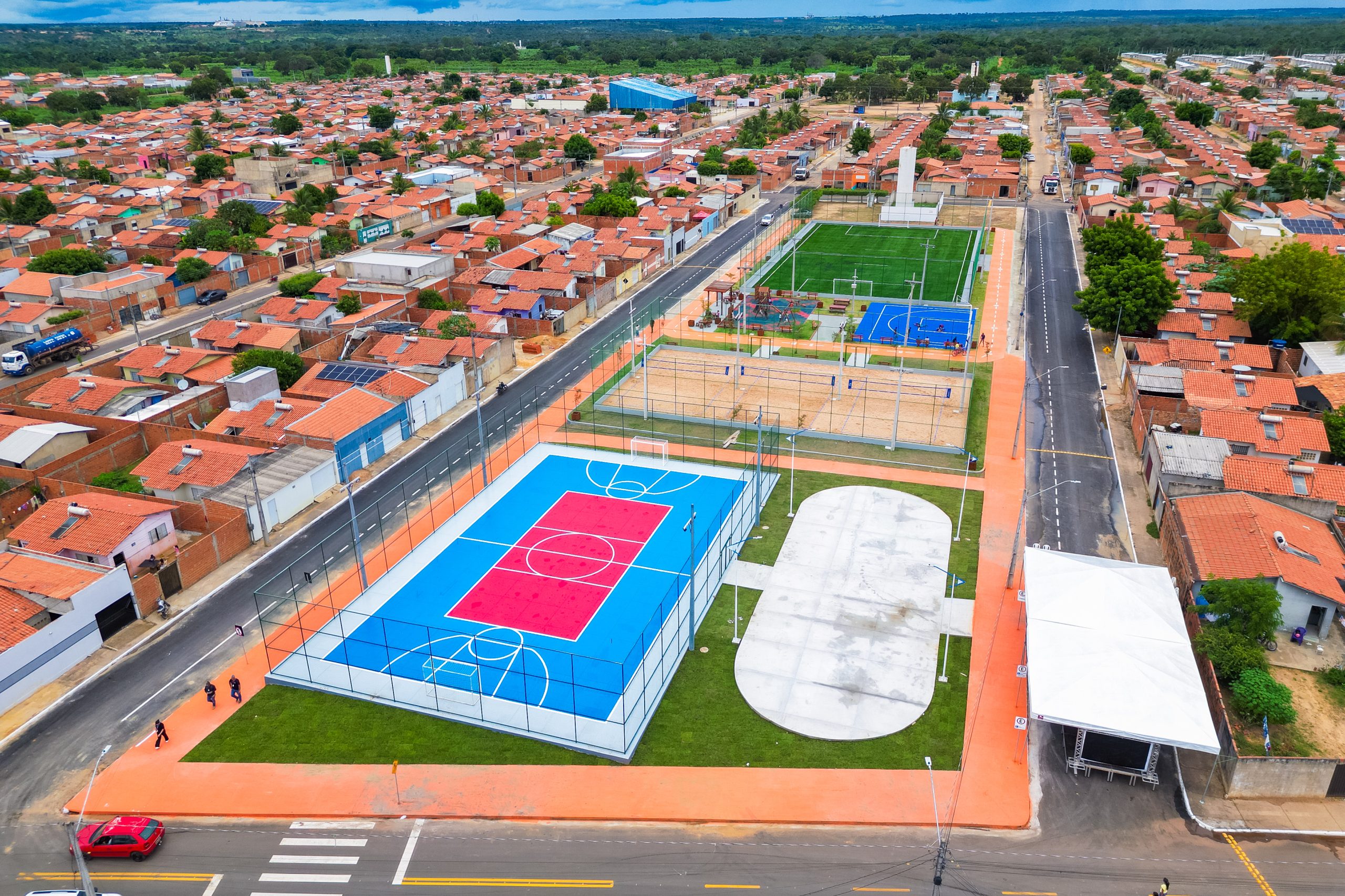 Localizado no bairro Rosa Santos, o Centro Esportivo inaugurado em Balsas oferece um espaço estruturado para a prática de diversos esportes e de convivência social, com campo de futebol, quadras, parquinho infantil, pista de caminhada, áreas de convivência e outros equipamentos