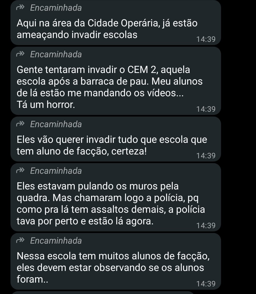 Sobretudo em grupos de WhatsApp, mas também pelo Instagram, anônimos espalham notícias falsas sobre uma suposta invasão a uma escola, em meio a uma onda de violência na área da Cidade Operária.